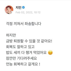 BTS üyesi Park Jimin`in sosyal medya da uzun süredir aktif olmaması hayranlarında bir şüphe uyandırmıştı. Bu şüphe doğru çıktı. Hybe Entertainment tarafından yapılan açıklama da; Jimin`in apandisit operasyonu geçirdiğini ve aynı zamanda Covid salgına yakalandığı söylendi. Şirketin bu açıklamaları üzerine, hayranların endişeleneceğini düşünen Park Jimin, Wewerse uygulaması üzerinden hayranlarını bilgilendirdi.